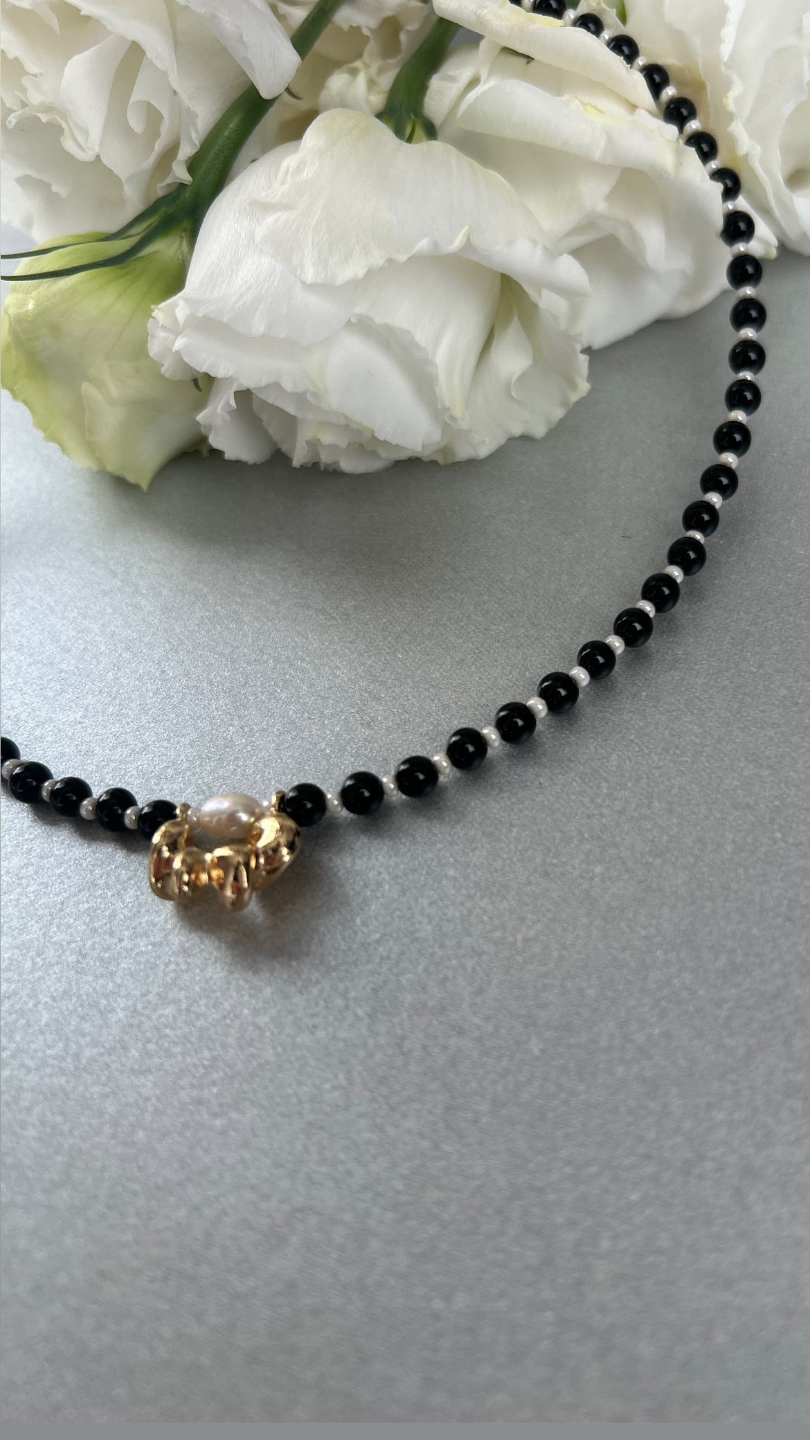 ▶︎ネックレス 素材/淡水パール、ガラスビーズ、アバロンシェル(チャーム) 金具/サージカルステンレス 長さ/37cm +5cmの調整金具付き アレーネの天然石ネックレスシリーズでも いつも完売のオニキスからクリスマス限定アイテム登場です オニキスの間にアイボリーカラーのガラスビーズを入れ 黒でも重たくないバランスに チャームのうねうねは、ニュアンス感が高まるデザイン そこに淡水パールを合わせ上品な大人なカジュアルネックレスに 身につけるだけで、スッと背筋が伸びる自信を持って歩み出したい!そんな方におすすめのネックレス 黒のコートと合わせても、暗くならず ワントーンコーデになって、よりおしゃれな雰囲気になりました
