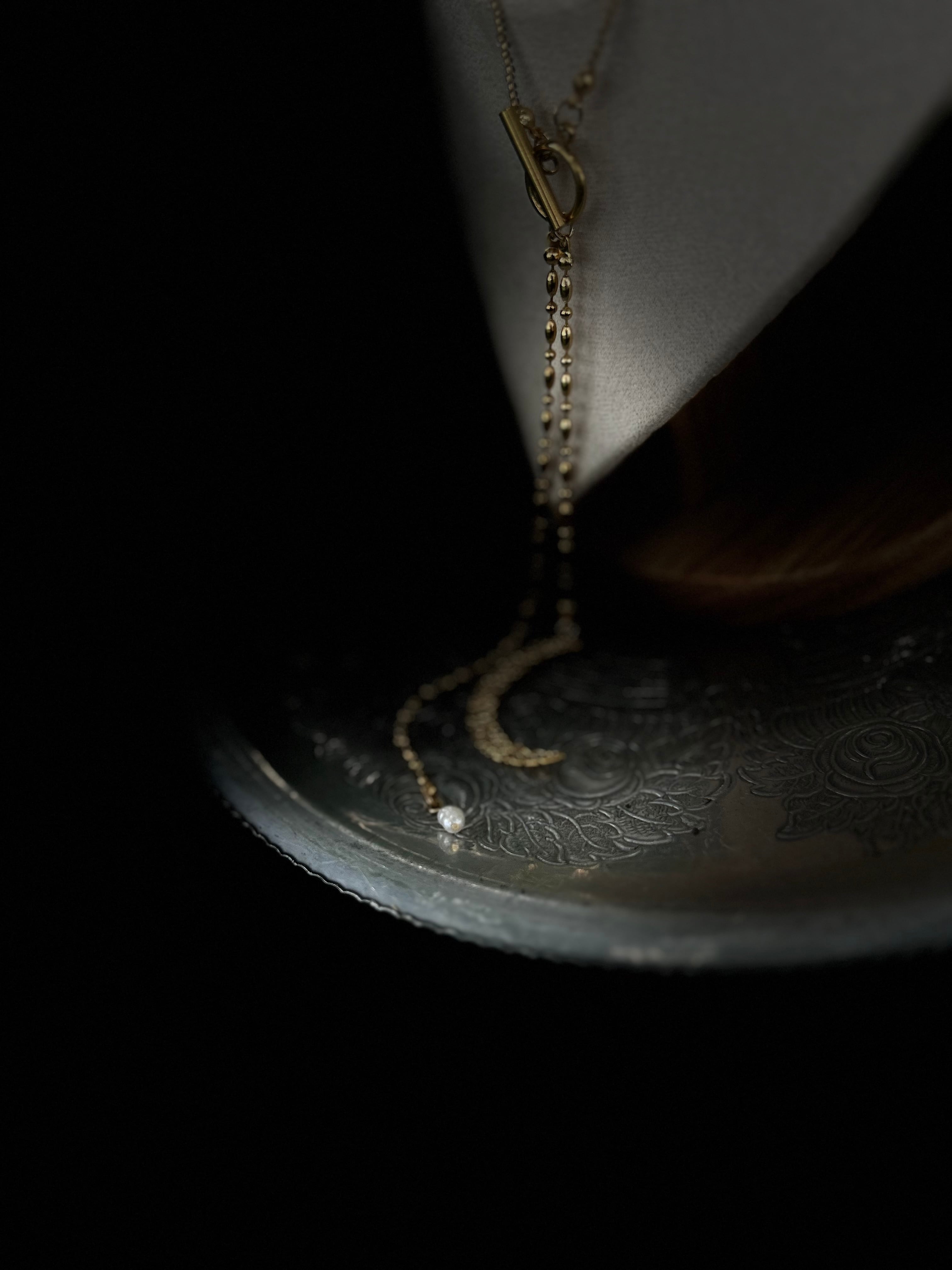 2本のチェーンは長さの違い、面長と丸がミックスしたデザインのある素材